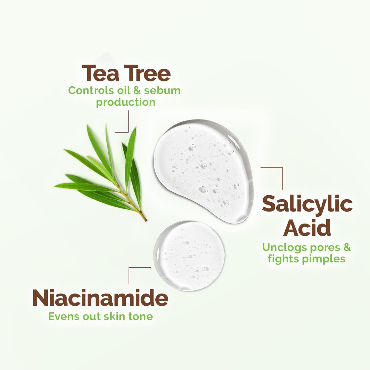 - Goodness of Tea Tree & Salicylic Acid This facewash combines Tea Tree and Salicylic Acid to deeply cleanse pores, remove dirt, impurities, excess oil, and prevent clogging that can cause pimples.