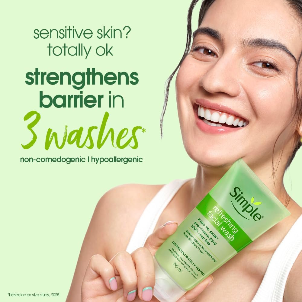 Simple Kind To Skin Refreshing Facial Wash 100% Soap-Free Facewash, Good skin starts with a healthy skin barrier. Skin barrier is your natural shield against external damage. Your skin barrier fights impurities, blocks irritants and retains moisture. We, at Simple, believe in making clean and kind products to maintain a healthy skin barrier.